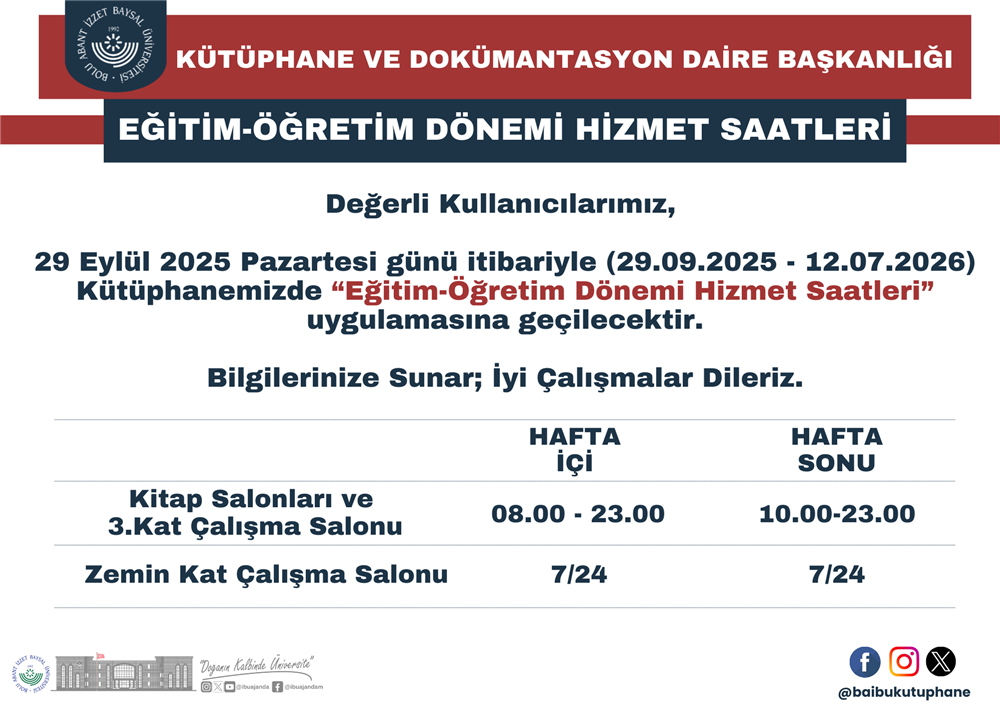 2025 - 2026 Eğitim-Öğretim Dönemi Güncel Hizmet Saatlerimiz