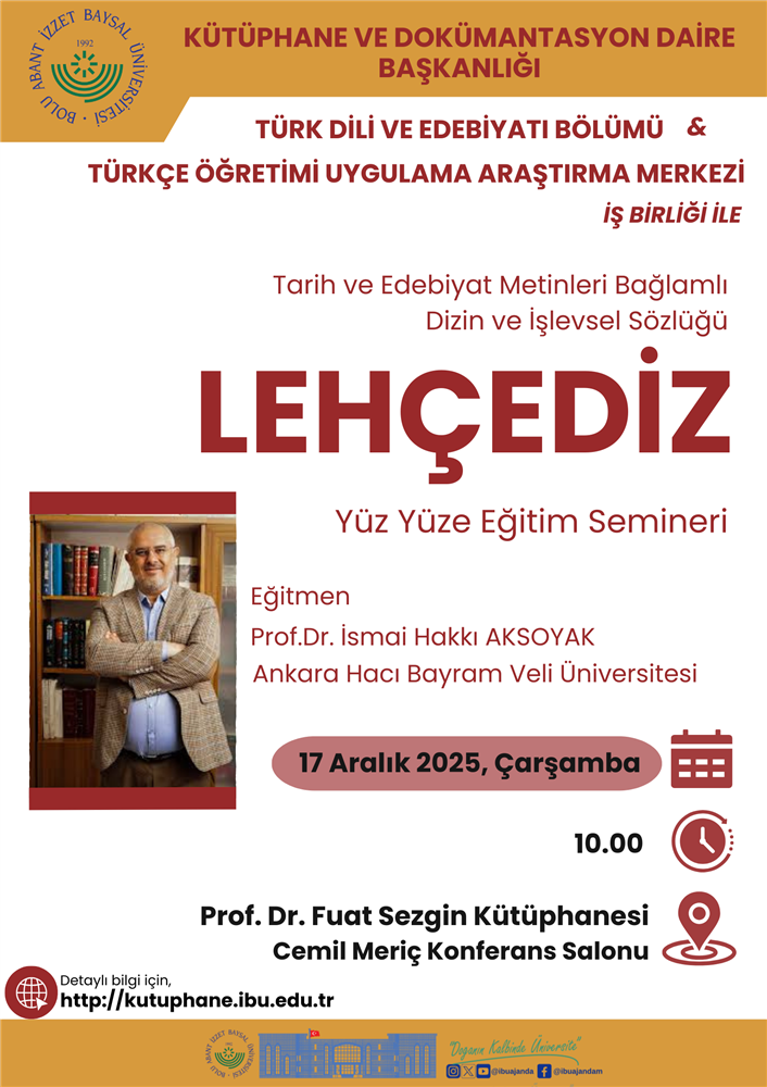Şu an deneme erişimi devam eden ve 2026 yılı itibariyle Üniversitemiz aboneliği sağlanacak olan Tarih ve Edebiyat Metinleri Bağlamlı Dizin ve İşlevsel Sözlüğü "Lehçediz" için veri tabanı proje sorumlusu Ankara Hacı Bayram Veli Üniversitesi'nden Prof.Dr. İsmail Hakkı Aksoyak'ın katılımıyla Kütüphane ve Dokümantasyon Daire Başkanlığımız, Türk Dili ve Edebiyatı Bölümümüz ile Türkçe Öğretimi Uygulama ve Araştırma Merkezimiz (TÖMER) iş birliğinde Kütüphanemiz Cemil Meriç Konferans Salonu'nda yüz yüze eğitim semineri düzenlenecektir.